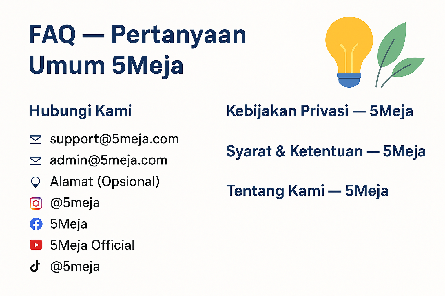 5Meja adalah platform digital yang menyediakan inspirasi, panduan, dan sumber daya untuk meningkatkan produktivitas, kreativitas, serta kinerja di dunia digital.